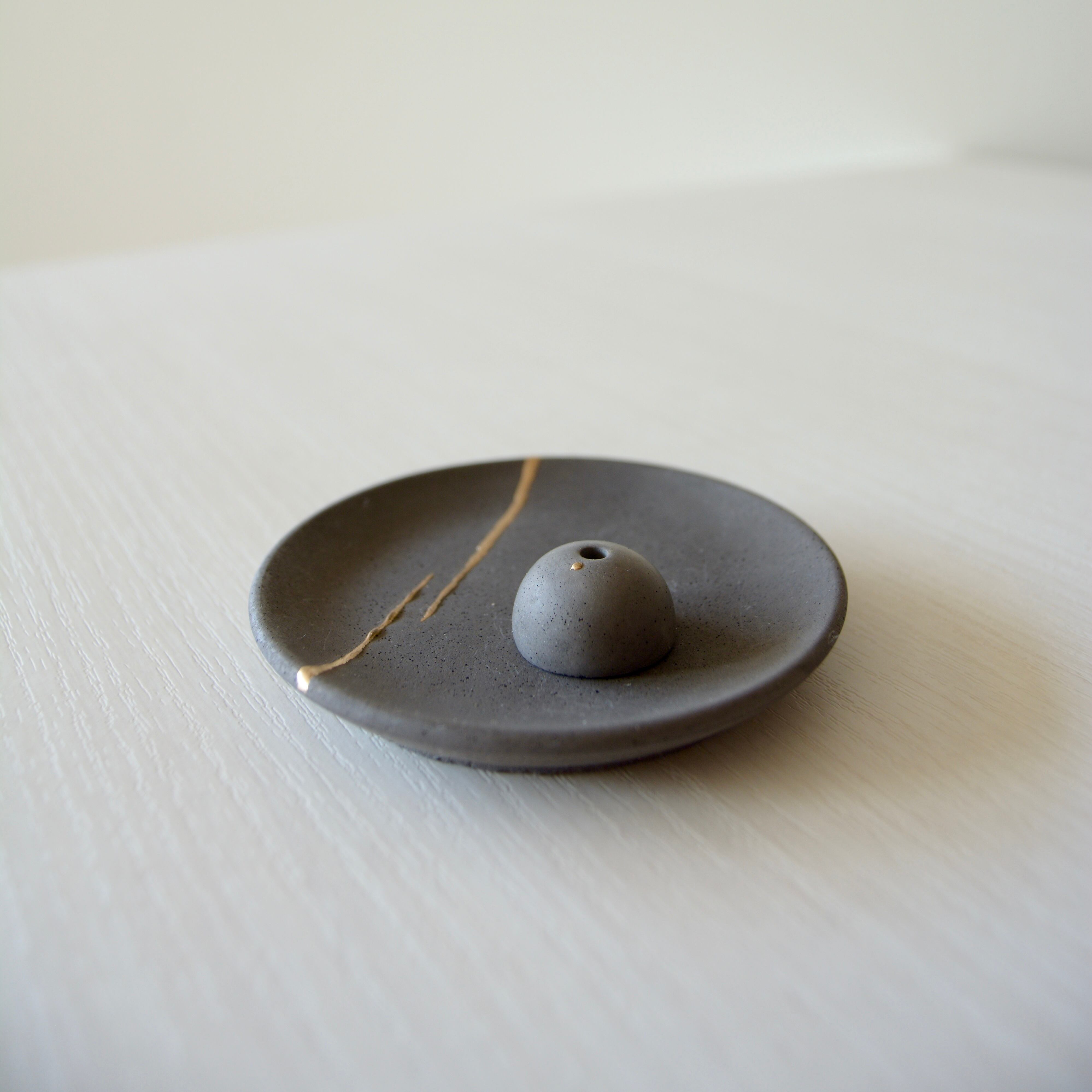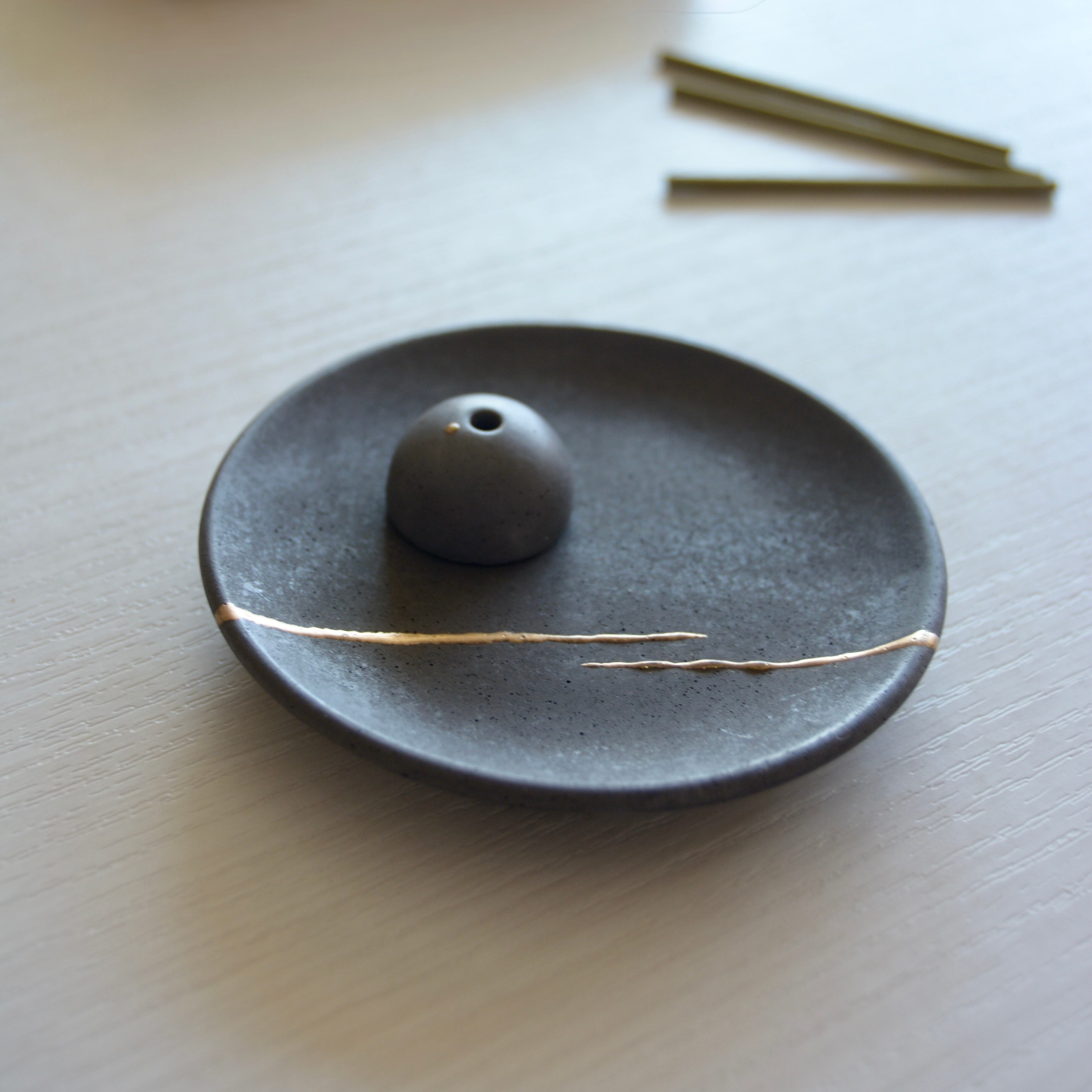 炭色のモルタル皿に走る金彩の線は、まるで闇夜を導く灯火のよう。
