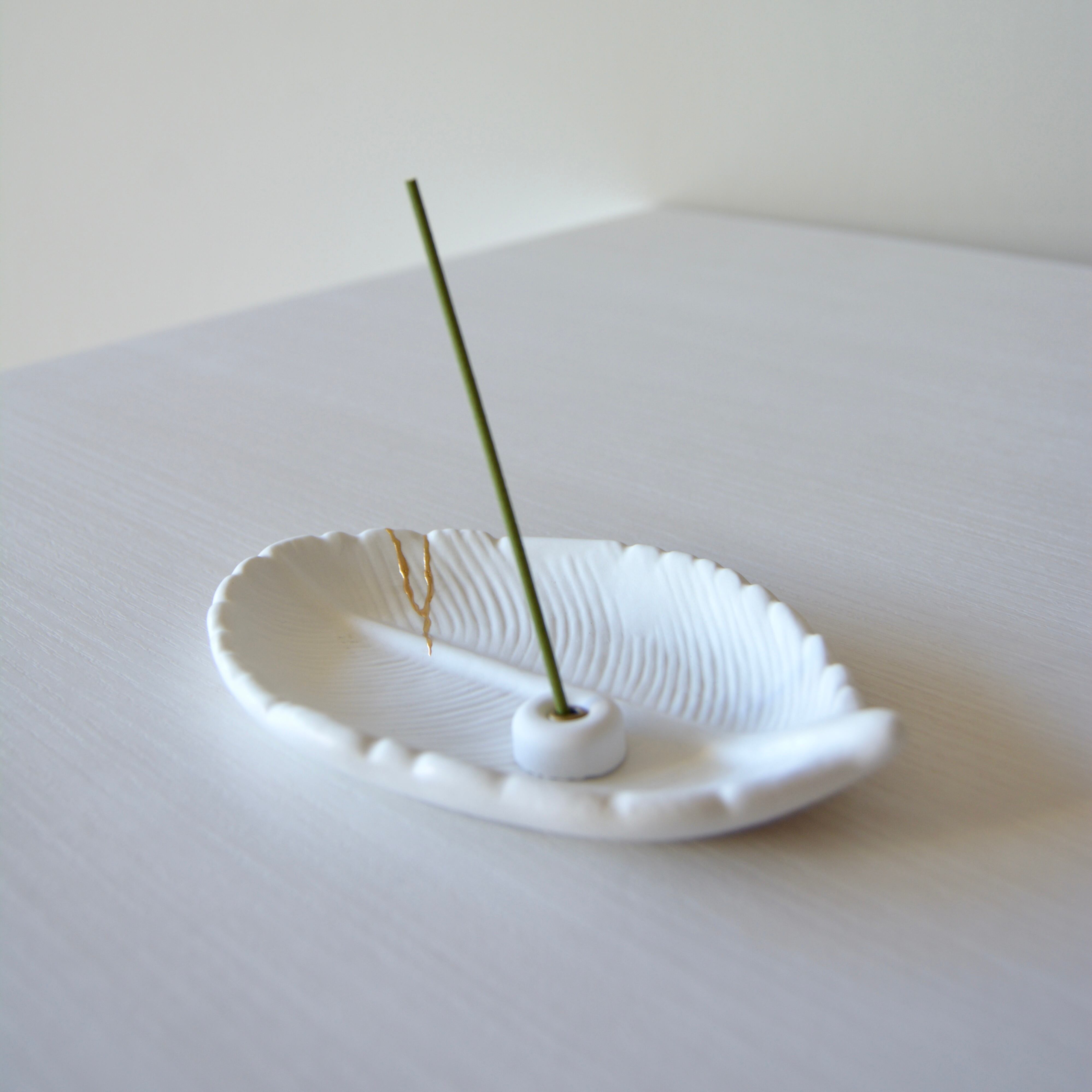 葉をかたどった香皿に、金粉の彩りをそっと重ねた、モルタル製のお香立てです。