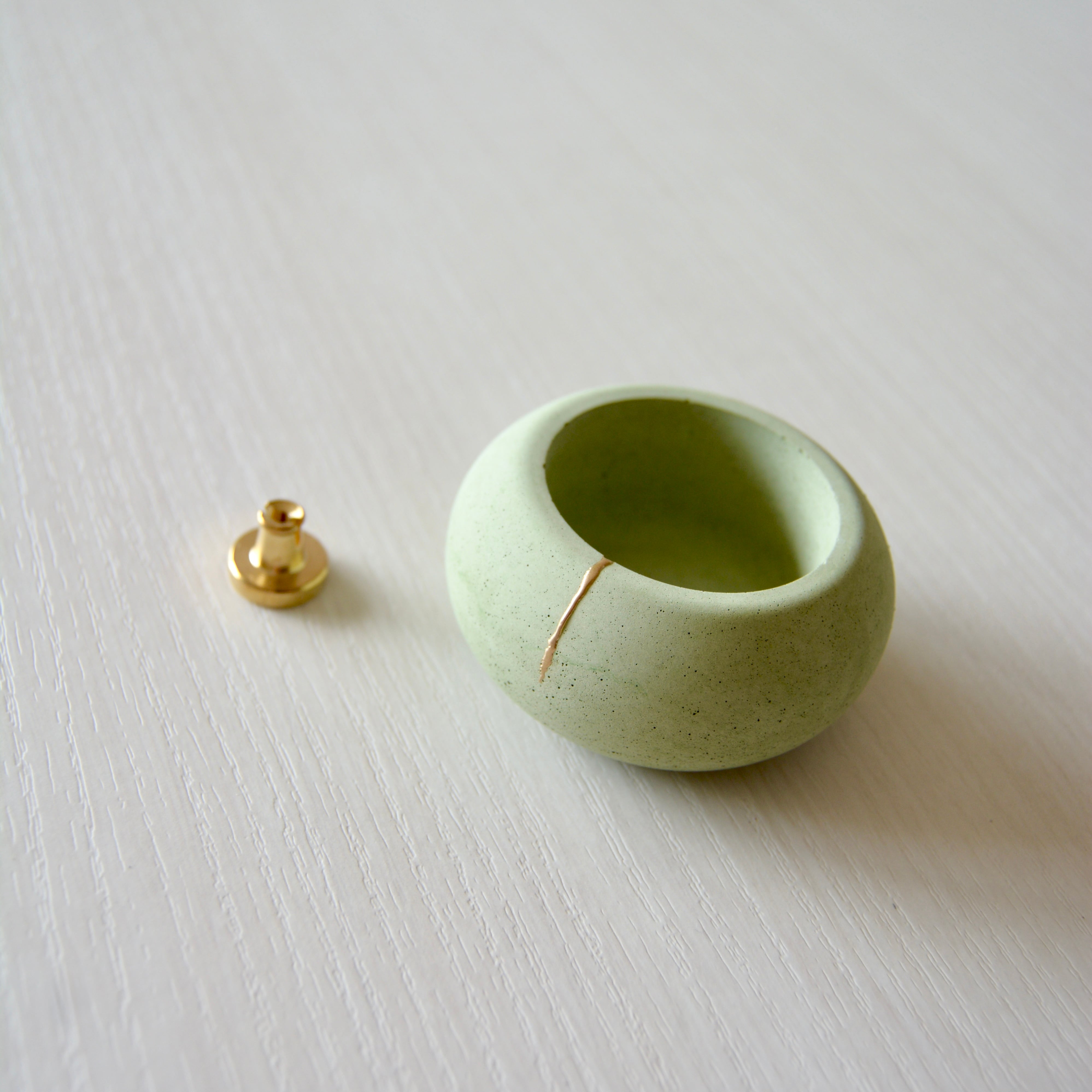 丸みのあるやさしいフォルムと、モルタルの質感。金粉を用いた装飾が、ほんのり華やかさを添えています。